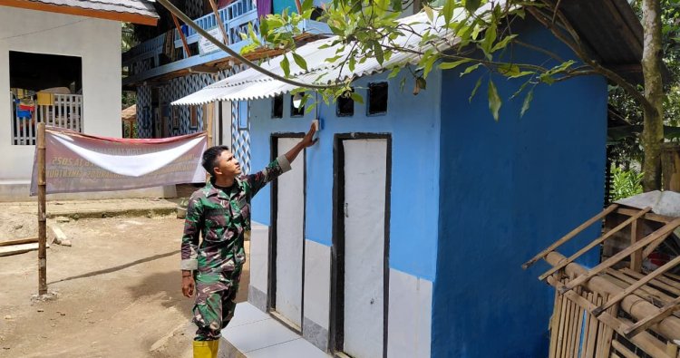 Dalam foto terlihat salah satu anggota Satgas TMMD sedang melakukan pengecekan hasil akhir bangunan MCK yang telah berdiri kokoh dan rapi. Pengecekan ini dilakukan sebagai bagian dari proses pengawasan kualitas bangunan agar hasil kerja dapat dimanfaatkan dengan baik oleh masyarakat.