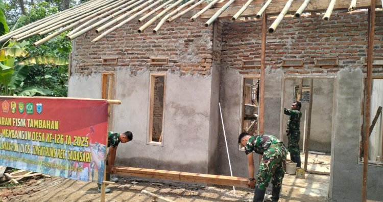 Kegiatan TNI Manunggal Membangun Desa (TMMD) ke-126 Kodim 0601/Pandeglang terus menunjukkan perkembangan signifikan. Memasuki hari ke-14 pelaksanaan, anggota Satgas TMMD bersama warga masyarakat masih dengan semangat tinggi melanjutkan pengerjaan perehaban Rumah Tidak Layak Huni (RTLH) di wilayah Desa Cikentrung, Kecamatan Cadasari, Kabupaten Pandeglang. Hingga hari ini, progres pengerjaan mencapai sekitar 55 persen.